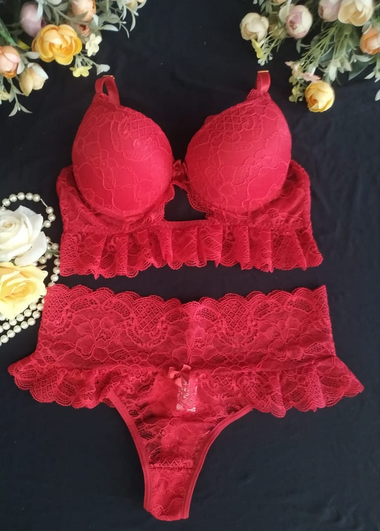 Sua embalagem contem: 01 Conjunto Sexy Em Renda Comfort Com Babado.